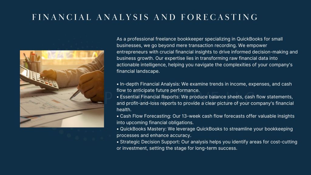 By leveraging our expertise in these areas, we help enhance your business operations, providing you with the financial clarity and insights needed to make informed decisions and drive your business forward. As a professional freelance bookkeeper specializing in QuickBooks for small businesses, I’m here to help you navigate these financial complexities and set the stage for long-term growth and success.