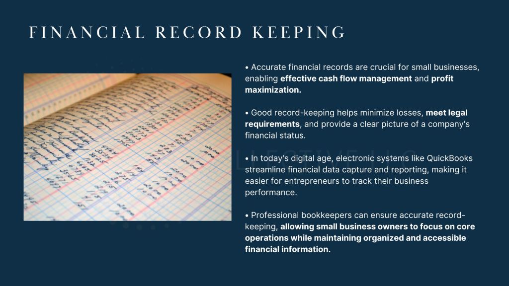 Accurate and up-to-date financial records are vital for any business to thrive. Good record keeping helps us minimize losses, manage cash flow effectively, and meet legal and regulatory requirements. We use these records to protect our business, measure performance, and maximize profits. In today’s digital age, electronic record-keeping systems, such as accounting software, make it easier to capture information and generate reports.