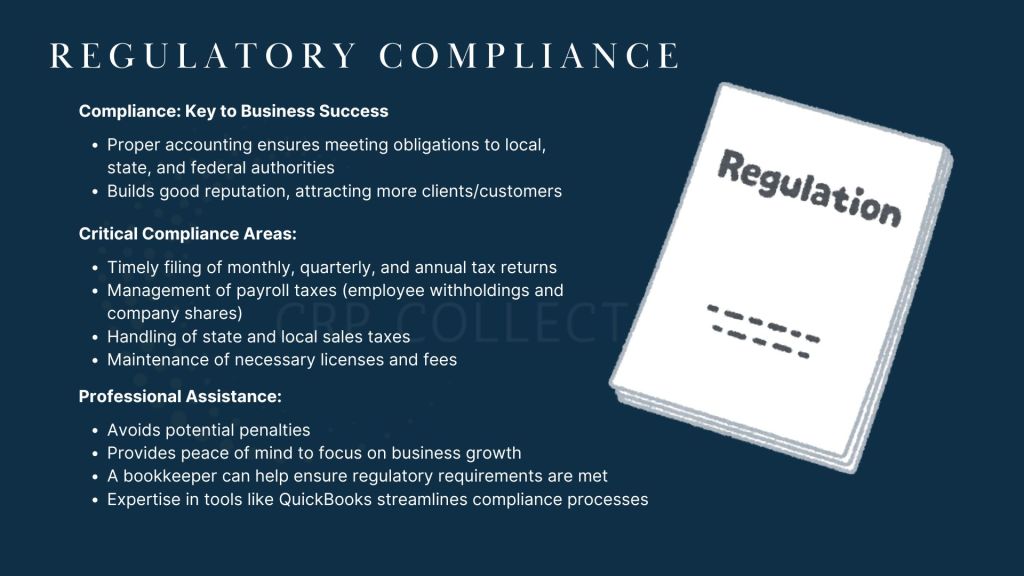 Compliance with regulations and laws is a critical aspect of running a successful business. Proper accounting practices ensure that we meet our obligations to local, state, and federal taxing authorities. This includes:
