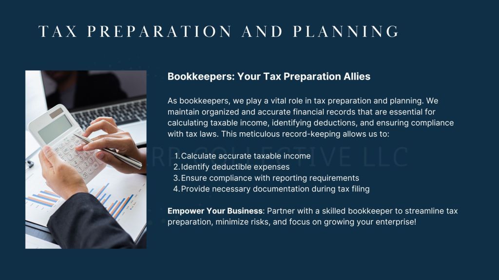 As bookkeepers, we play a vital role in tax preparation and planning. We maintain organized and accurate financial records that are essential for calculating taxable income, identifying deductions, and ensuring compliance with tax laws. This meticulous record-keeping allows us to: